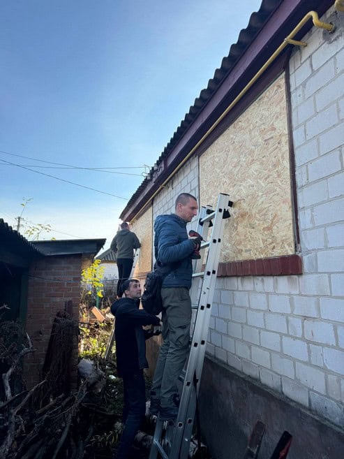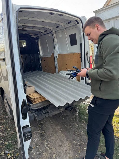 Прибывшему домой в отпуск военному помогаем с ремонтом автомобилей. Нашли и закупили резину, поврежденную шраплелью, а староста села Дмитрий Шевченко решает вопрос с поиском и заменой выбитых окон автомобилей.